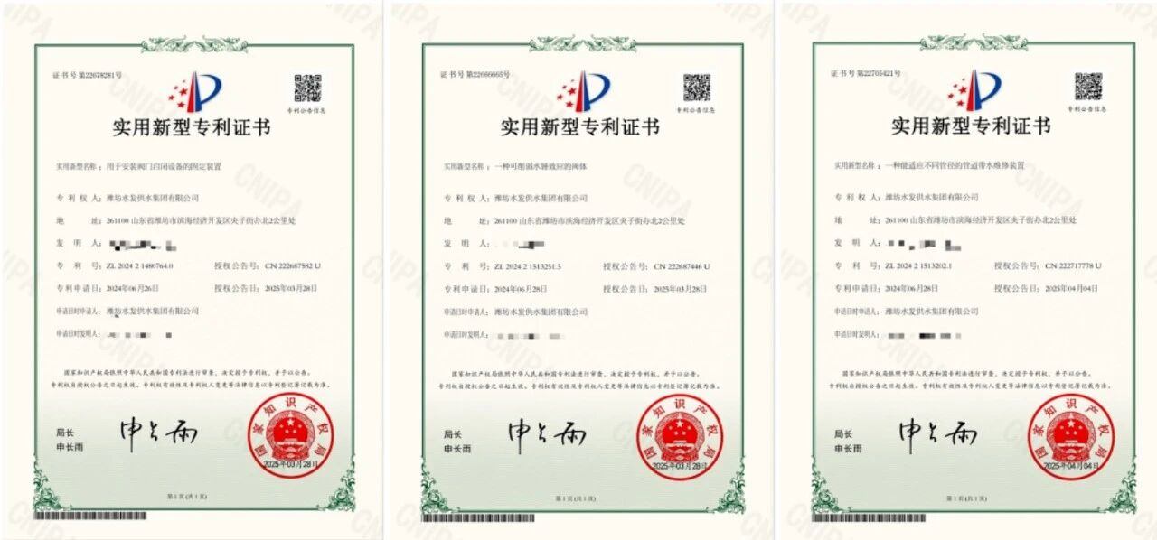 此外,濰坊區(qū)域還新增3項實用新型專利,涵蓋設備安裝、系統(tǒng)防護與維修維護等多個應用場景:《用于安裝閥門啟閉設備的固定裝置》提升了復雜環(huán)境下的施工效率;《一種可削弱水錘效應的閥體》增強了供水系統(tǒng)穩(wěn)定性;《一種能適應不同管徑的管道帶水維修裝置》實現(xiàn)了高效不停水維修。三者與前述發(fā)明專利、軟著協(xié)同發(fā)力,初步構建起“檢測-控制-維護”的水務管網(wǎng)技術創(chuàng)新體系。